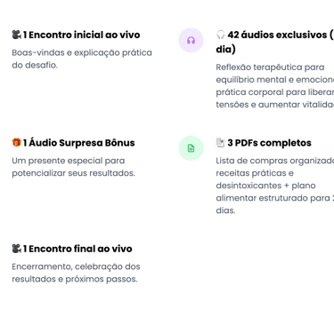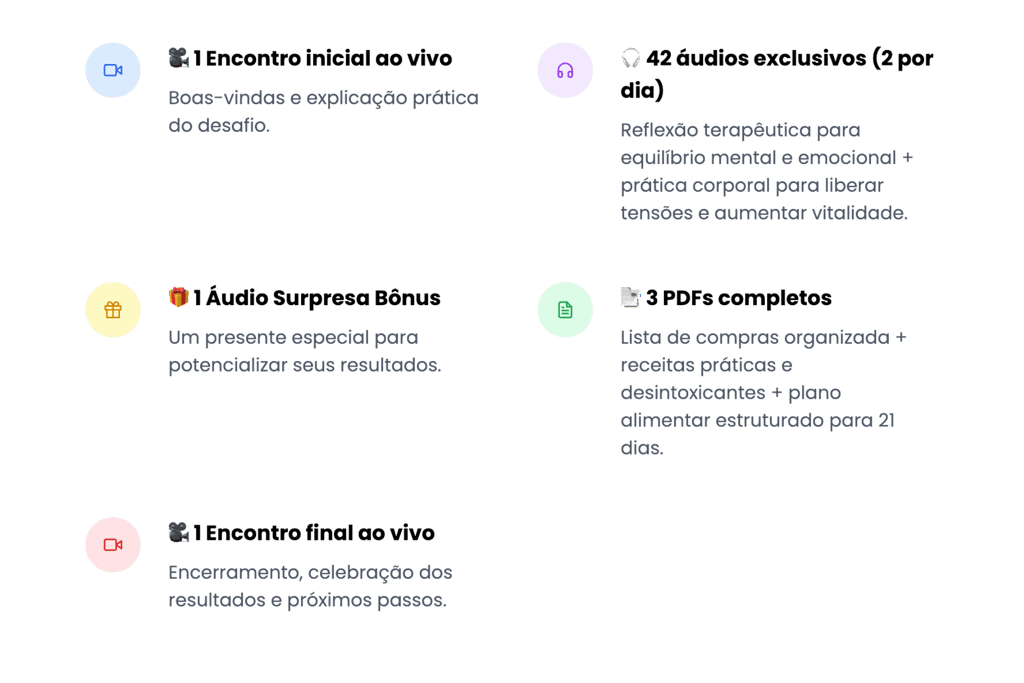 Inclui encontros ao vivo, áudios diários, práticas corporais e materiais de apoio como PDFs e receitas.
